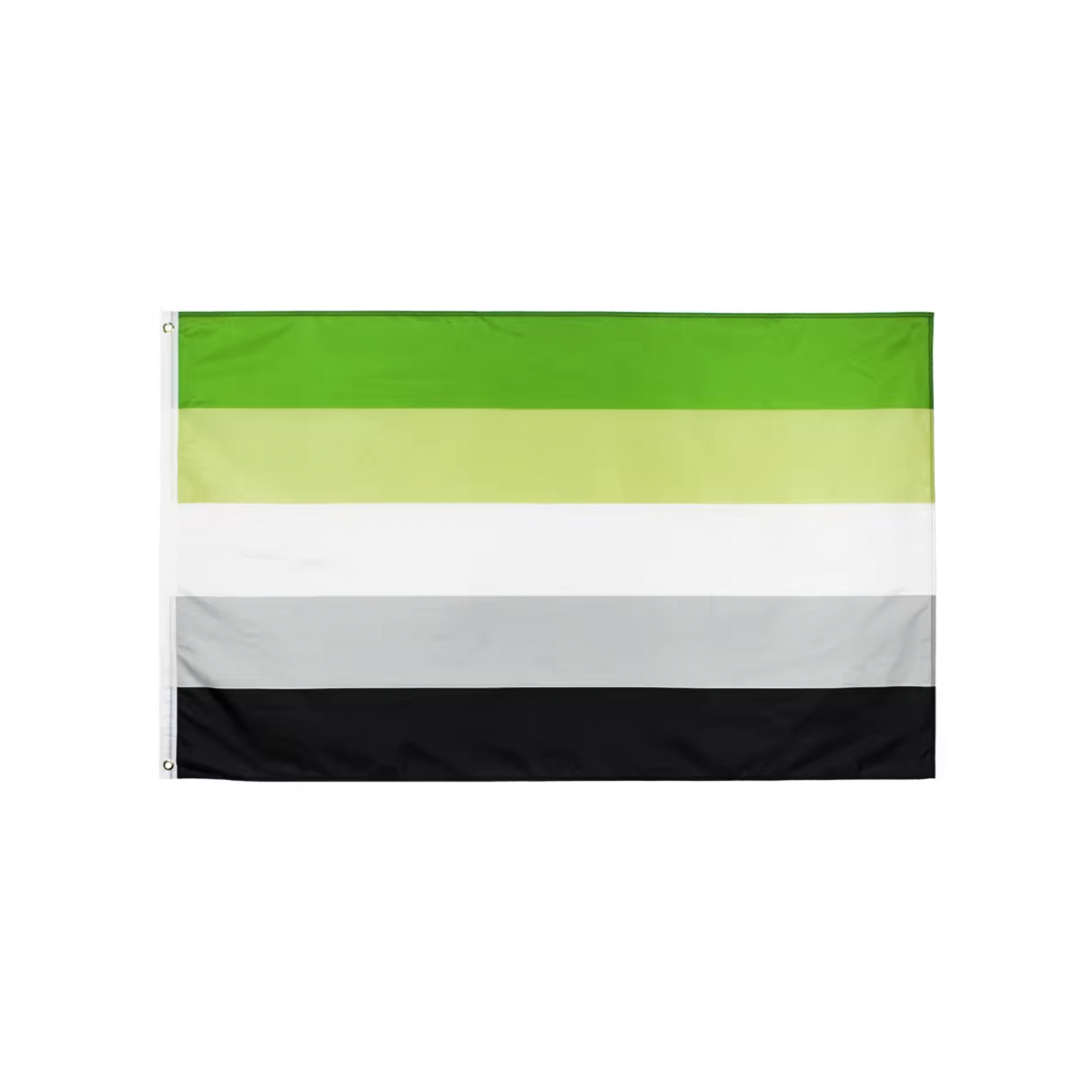 Aromantic Pride flag made of light polyester fabric. It is well suited, for example, as a wall flag or a procession sign. Reinforced seam on the other side with two holes for fastening.