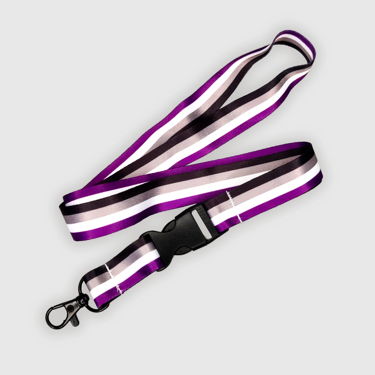 Handy Asexual Pride key chain with clip. In addition to keys, it is well suited for carrying, for example, a name tag, an identification card or a walking stick. With the help of the clip, you can easily detach the end of the key lanyard, so you can use it without removing the lanyard itself from your neck.