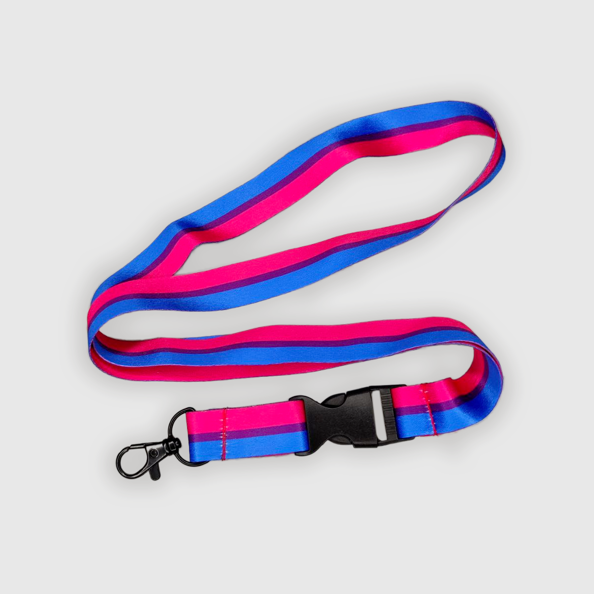 Handy Bisexual Pride key chain with clip. In addition to keys, it is well suited for carrying, for example, a name tag, an identification card or a walking stick. With the help of the clip, you can easily detach the end of the key lanyard, so you can use it without removing the lanyard itself from your neck.