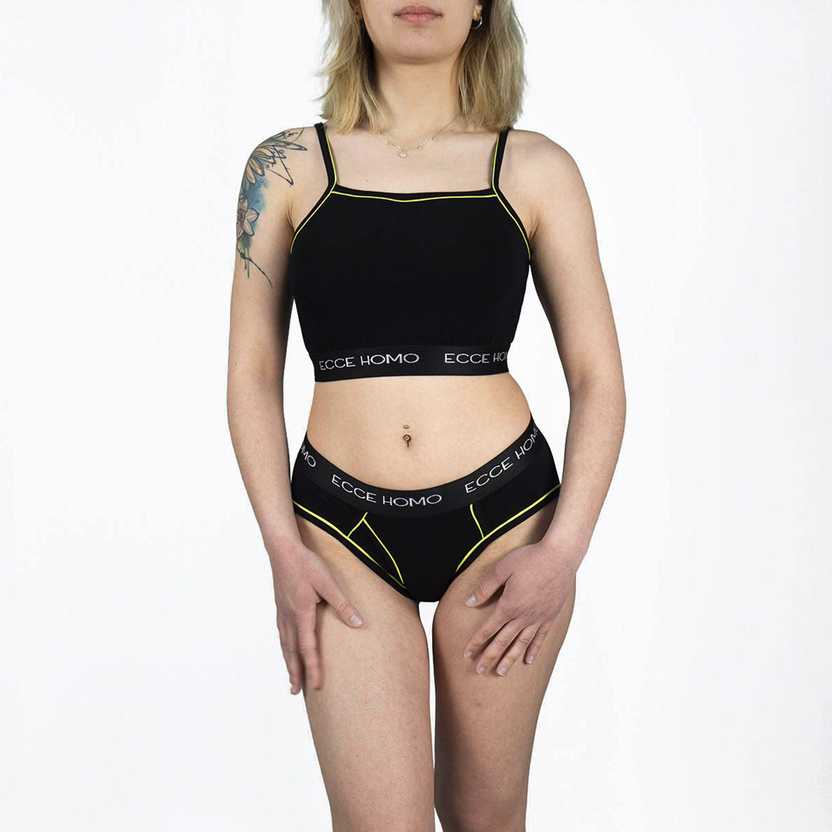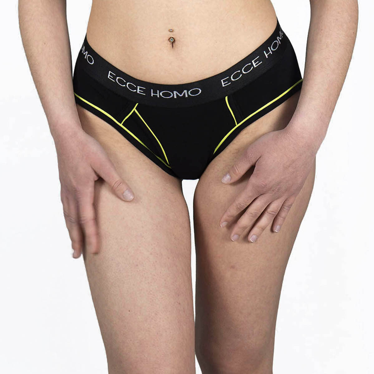 The high-quality and comfortable Obsidian Briefs have a waistband with the Ecce Homo logo and playful lime green details on the seams.