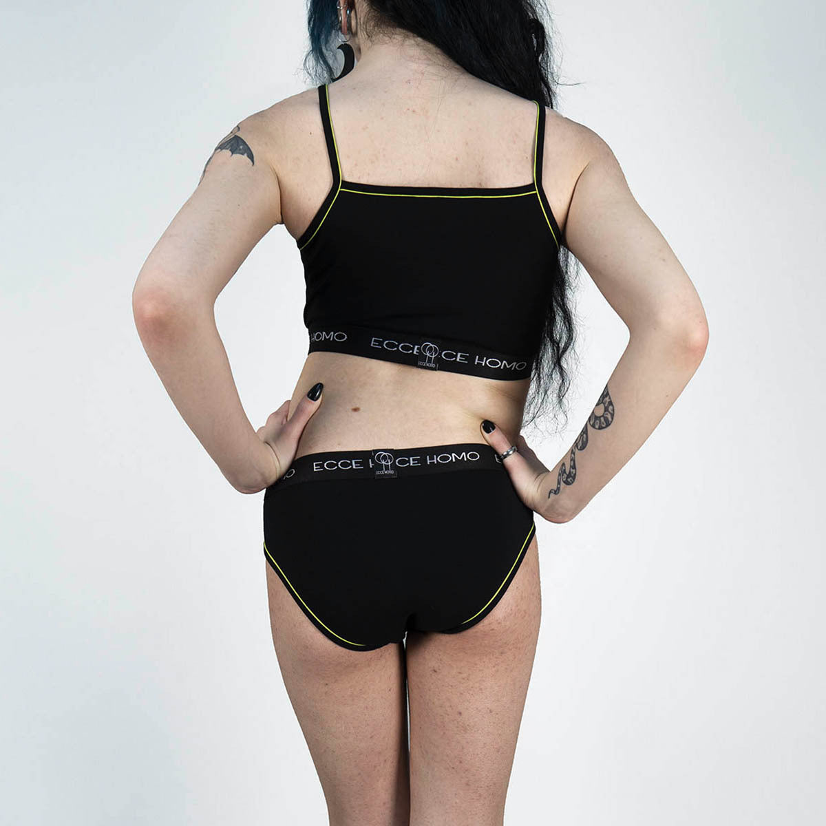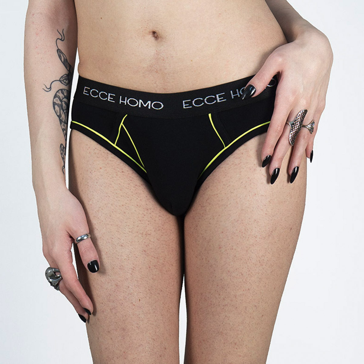The high-quality and comfortable Obsidian Briefs have a waistband with the Ecce Homo logo and playful lime green details on the seams.