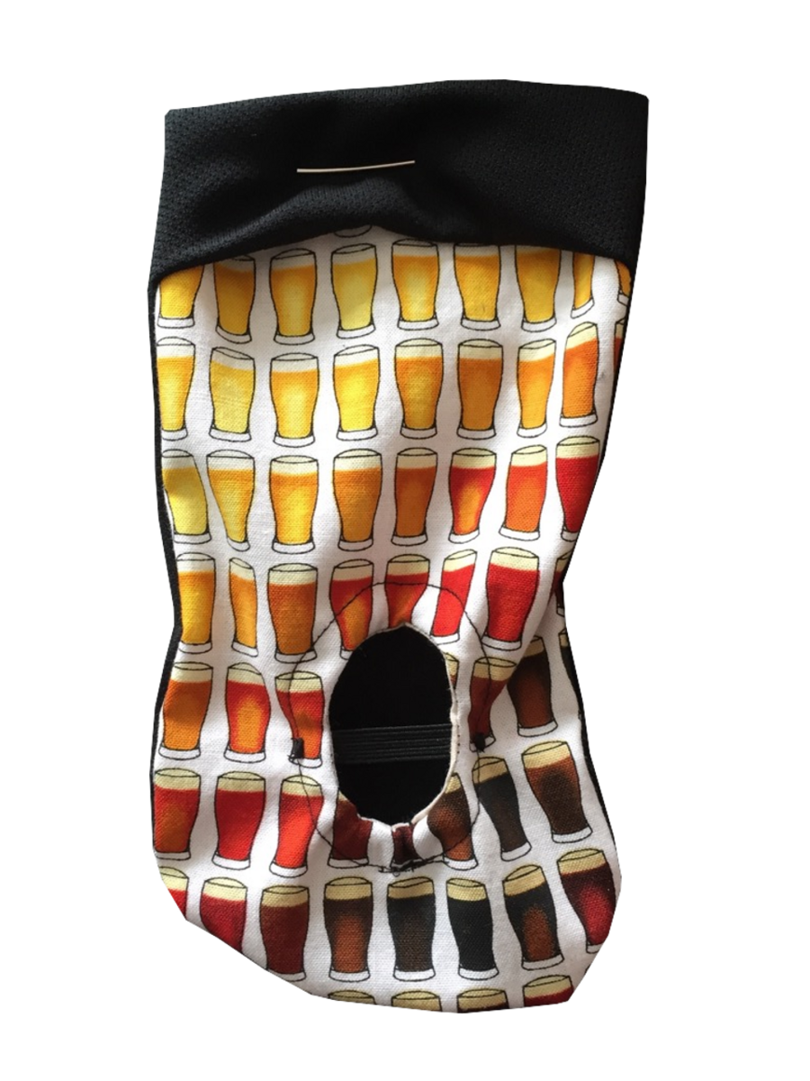 Cotton front, polyester-cotton lining. Back of antimicrobial, moisture-wicking polyester. The hole is inflexible. Fastening with a safety pin.
