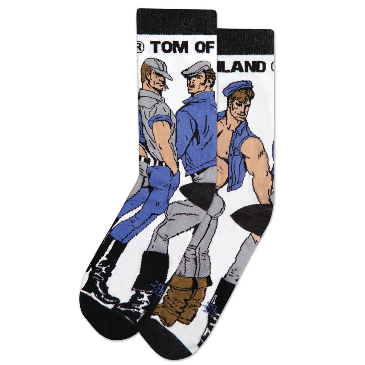 Our Tompa! Socks decorated with the illustrations of the beloved Tom Of Finland, where the trio dressed in denim pose.