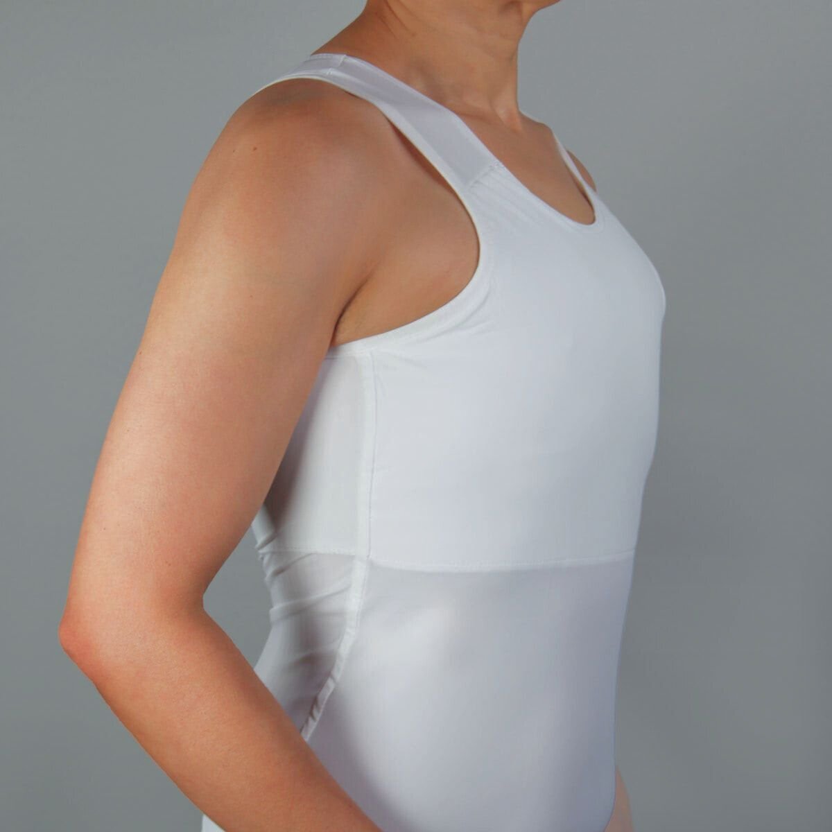 Sporty long binder with breathable back and elasticated rib. The mesh fabric on the back makes the binder very breathable, which makes it also great for an active lifestyle. The back is elastic and the front has a non-elastic, flattening lining at the chest, with the waist part elastic throughout.