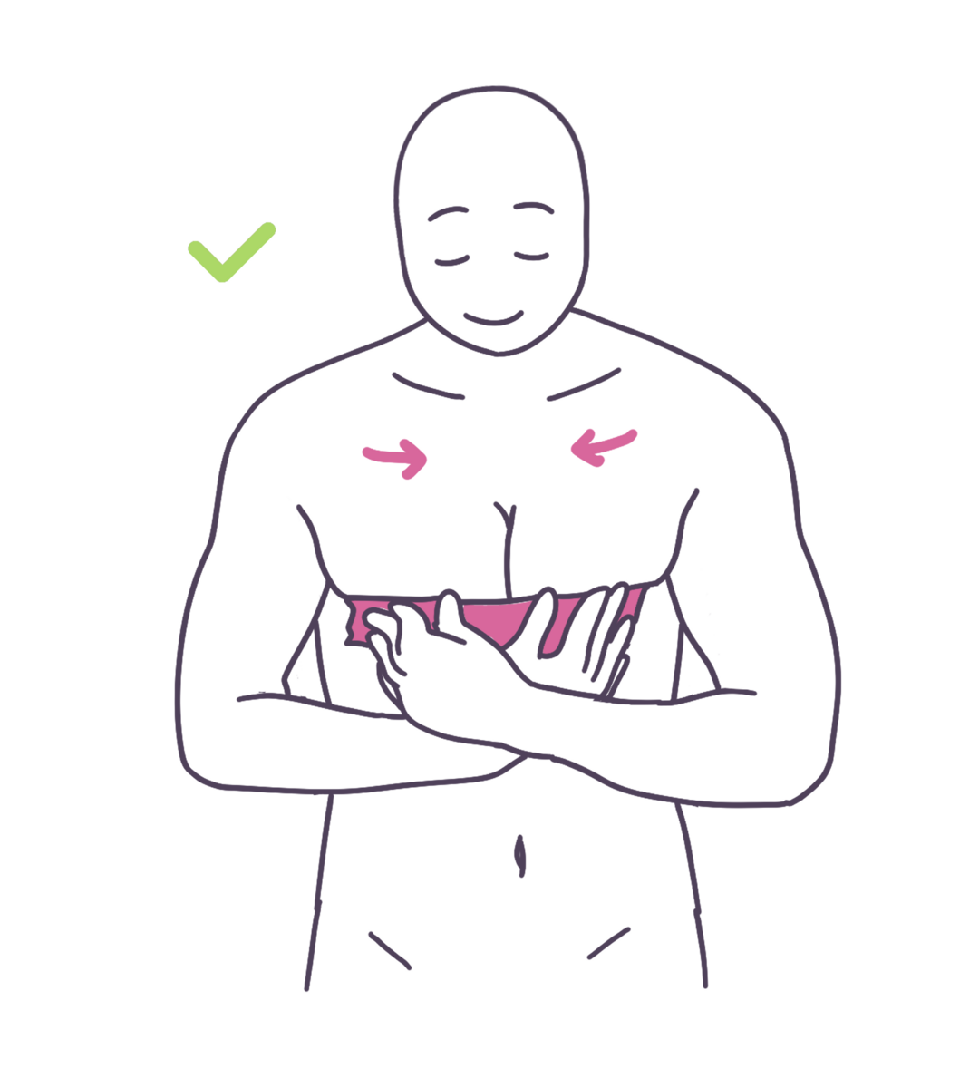 If you want to create a flatter chest, cut a 15-20 cm piece of tape and glue its end in the middle of the breast so that it goes just over the nipple. Tighten the tape sideways and glue it to your side so that the tape pulls the breast tissue towards the armpit. If you have a lot to tape, you can repeat this step by placing the next piece of tape on top of the previous one, and if necessary, still a third piece in the middle of the previous ones. Never tape all the way around the chest. The tape is designed to tighten on the skin, and taping around the chest can cause shortness of breath.