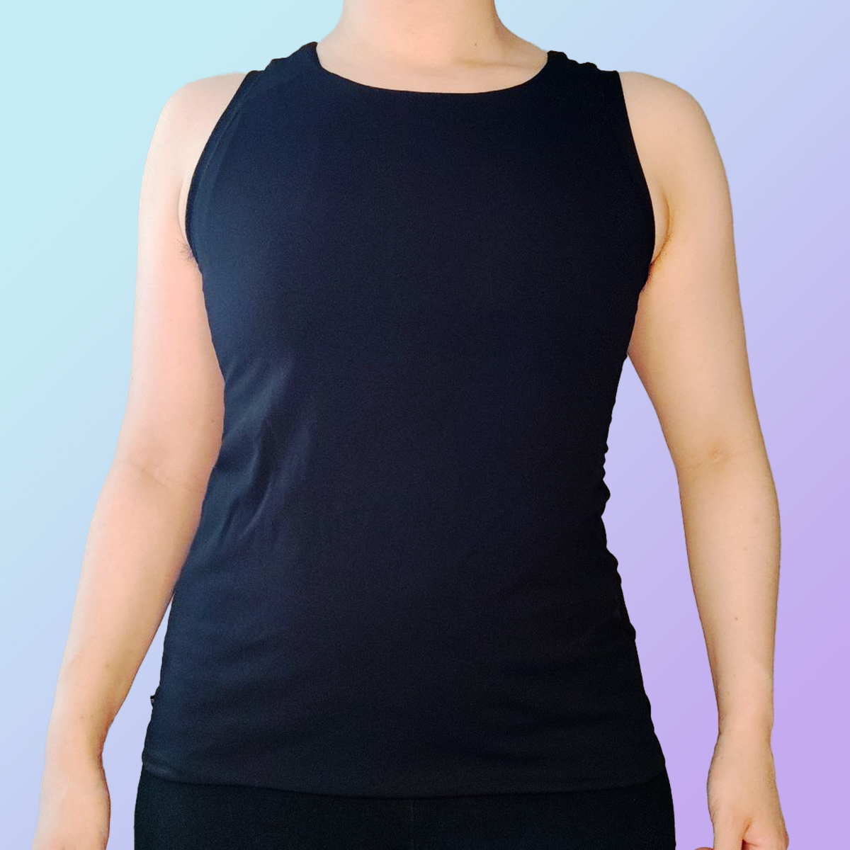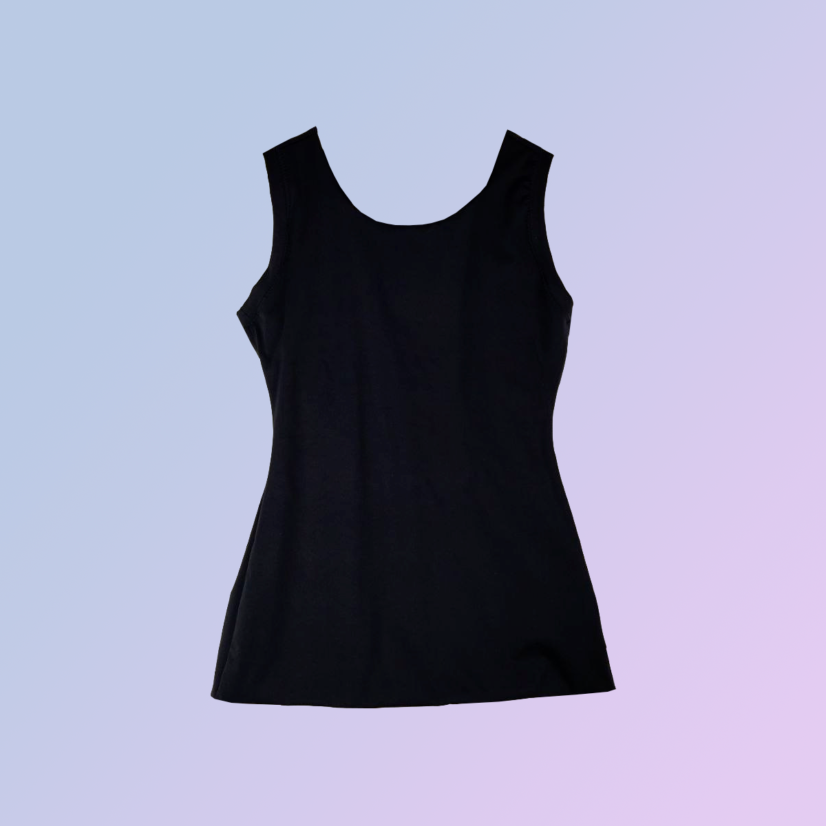 The higher collar ensures that even a larger amount of tissue stays firmly in place. The flared waist part allows the diaphragm to move freely, so you can breathe comfortably even while wearing a binder. Wide armholes and a wrestler's back guarantee the best mobility for the hands and upper back.