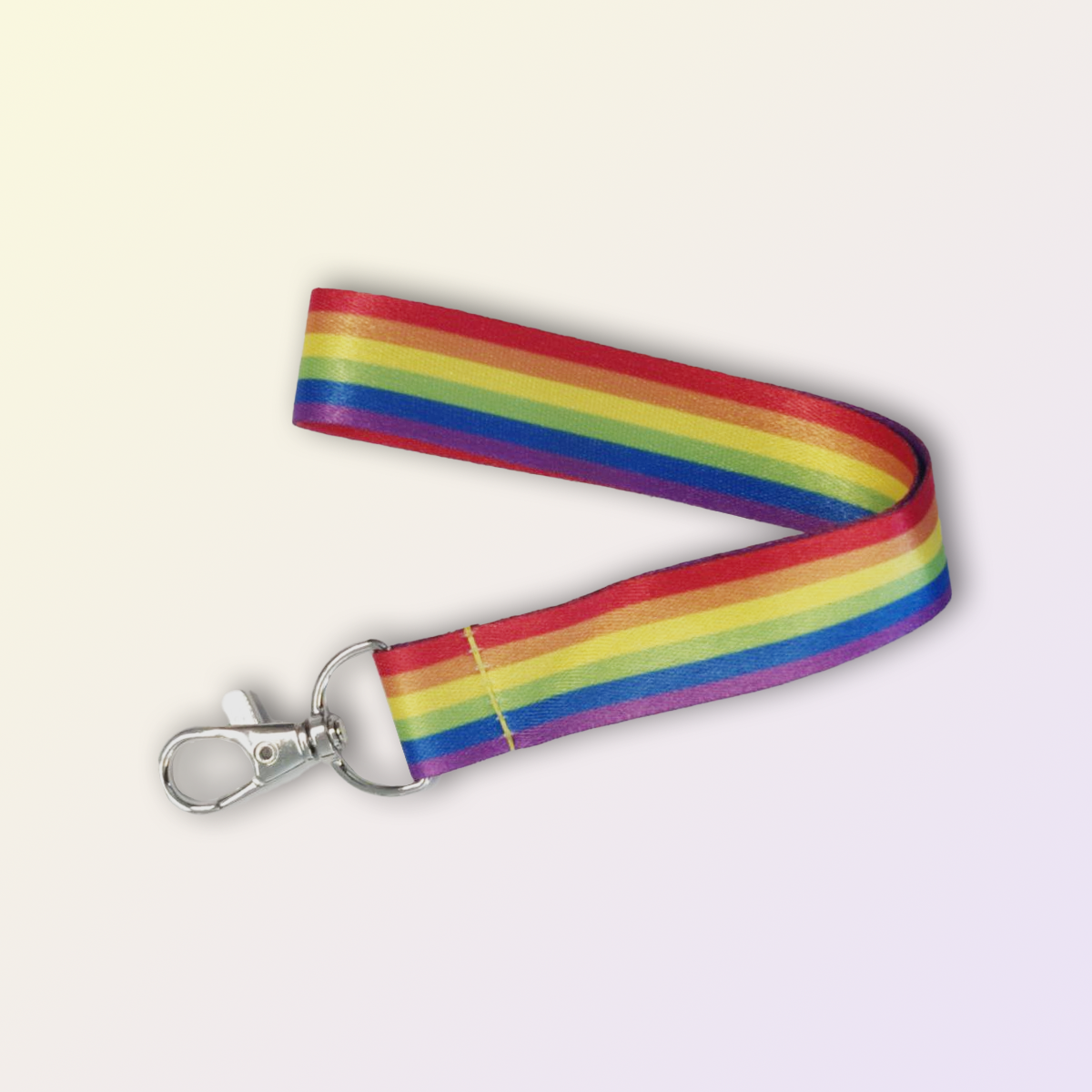 A handy wrist-length key ring in Rainbow Pride colors. Fastening with a metal parrot lock.
