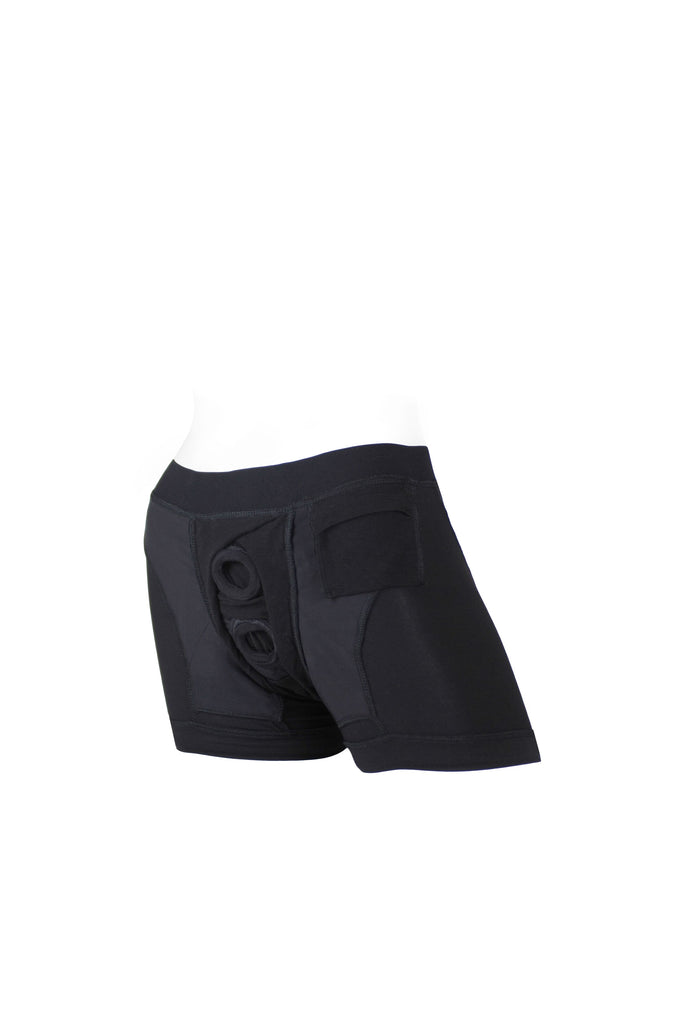 SpareParts HardWear's awesome Tomboi 2 is now here! The boxer-style pack&play-harness is great even for daily use. Moisture-wicking material guarantees comfort. Suitable for multi-sized prostheses and strap-ons; the flexible ring makes it easy to slide the prosthesis into place. Two built-in pockets for bullet vibrato. Color black.