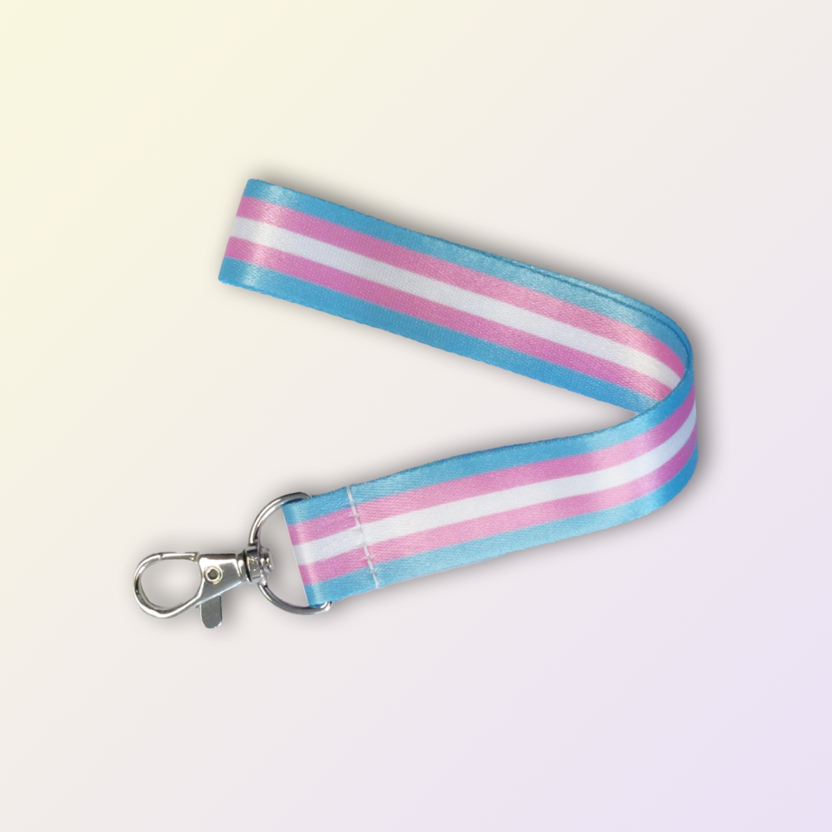 Handy wrist-length key chain in Trans Pride colors. Fastening with a metal parrot lock.
