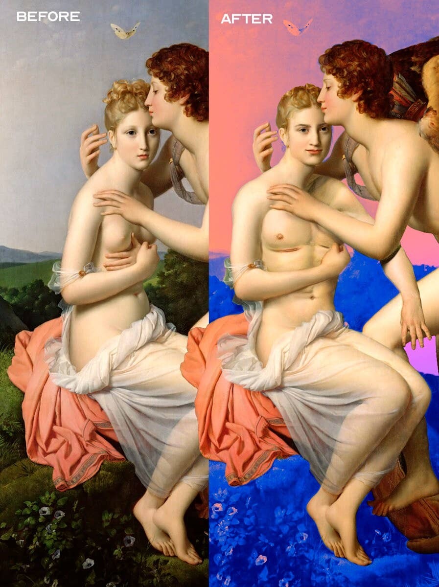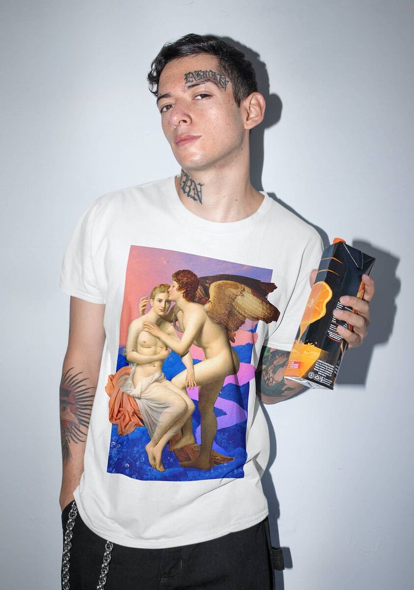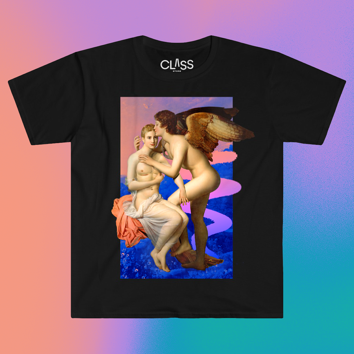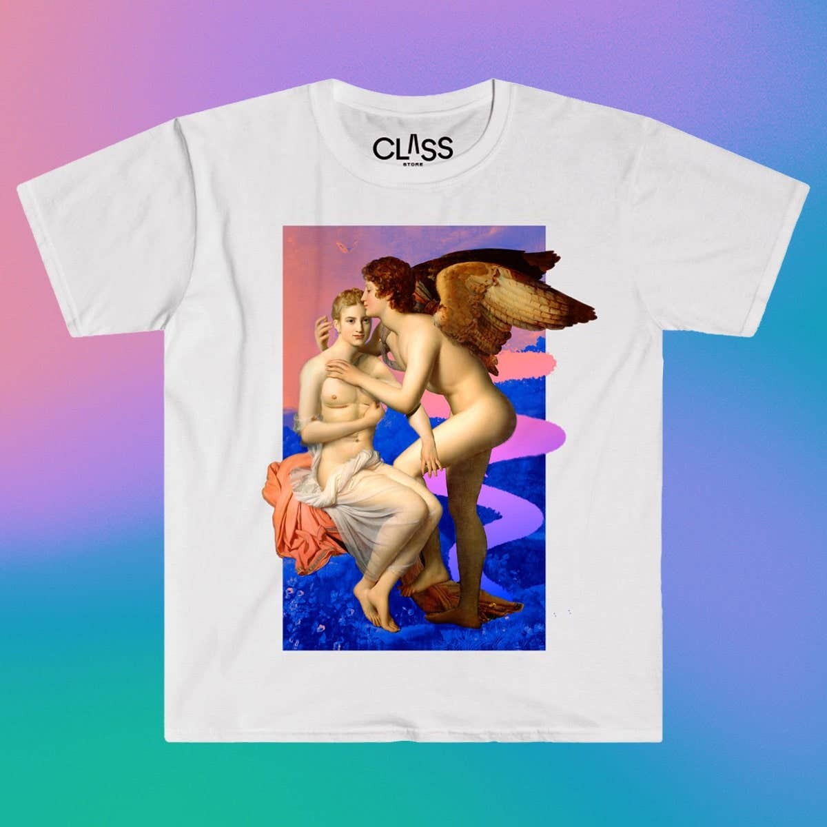 This t-shirt features Cupid and Psyche, based on François Gérard's famous painting. Psyche is depicted as transmasculine.