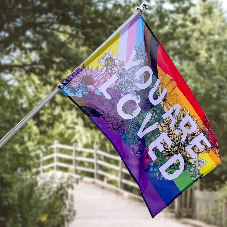 A wonderful Pride flag with an art print to decorate a balcony, window, wall or even as a parade flag for Pride.